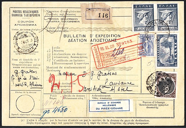 | 1929 Paketkarte mit waagrechtem Paar 25 Dr. Steindruck (Mi. Nr. 207) und weiteren Werten in die Schweiz, in guter Erhaltung | CHF 30.-- |