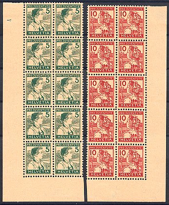 | 1915 Pro Juventute, Appenzeller Knabe + Luzerner Mädchen (Kat. Nrn. J 2-3, Mi. Nrn. 128-129), komplette Serie in Zehnerblocks, sauber postfrisch ** | CHF 675.-- |