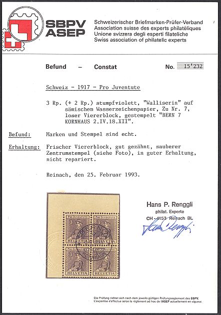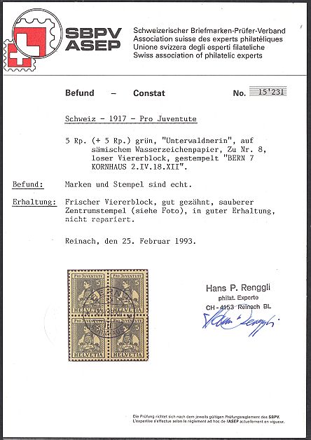 | 1917 Trachtenbilder (Kat. Nrn. J 7-9, Mi. Nrn. 133-135), komplette Serie in Viererblocks, sauber postfrisch **, fehlerfrei | CHF 175.-- |