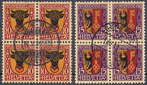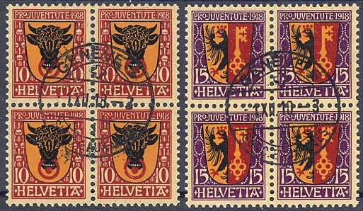 | 1918 Wappen (Kat. Nrn. J 10-11, Mi. Nrn. 143-144), komplette Serie in Viererblocks mit Bogenrand, sauber postfrisch **, fehlerfrei | CHF 95.-- |