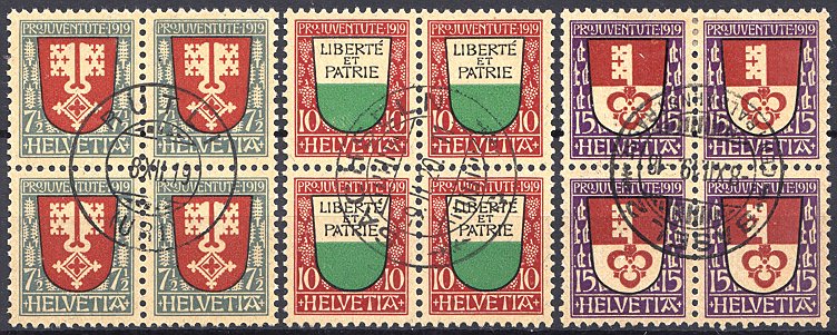 | 1919 Wappen (Kat. Nrn. J 12-14, Mi. Nrn. 149-151), komplette Serie in Viererblocks, sauber postfrisch **, fehlerfrei | CHF 75.-- |