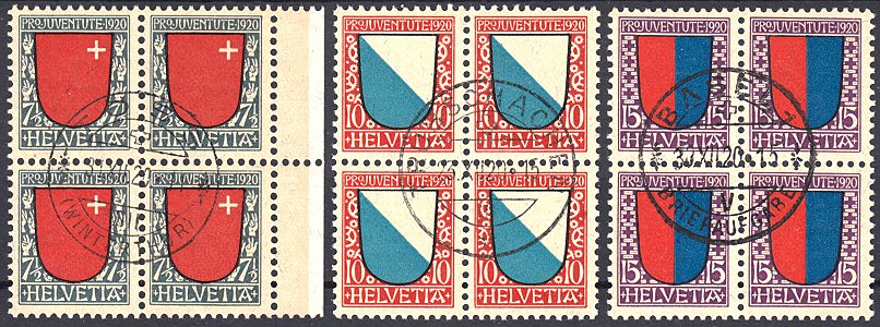 | 1920 Wappen (Kat. Nrn. J 15-17, Mi. Nrn. 153-155), komplette Serie in Viererblocks, sauber postfrisch **, fehlerfrei | CHF 80.-- |