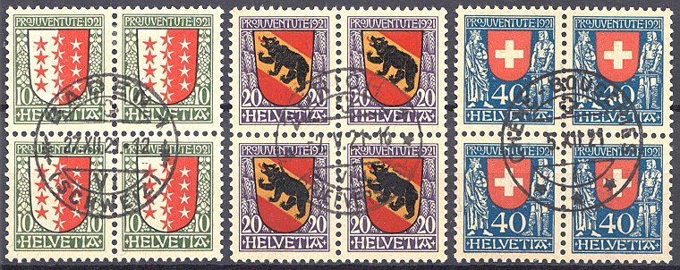 | 1921 Wappen (Kat. Nrn. J 18-20, Mi. Nrn. 172-174), komplette Serie in Viererblocks, sauber postfrisch **, fehlerfrei | CHF 75.-- |
