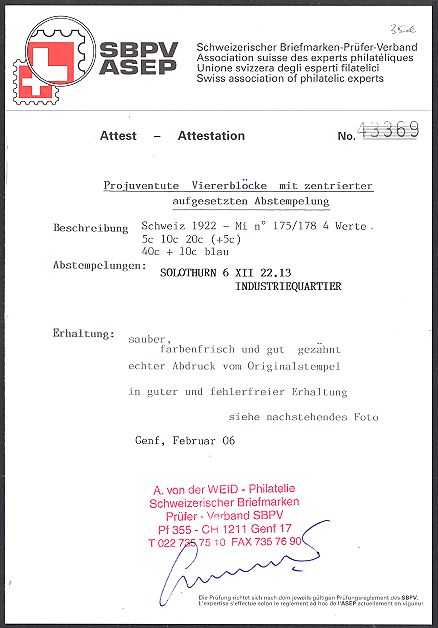 | 1922 Wappen (Kat. Nrn. J 21-24, Mi. Nrn. 175-178), komplette Serie in Viererblocks, sauber postfrisch **, fehlerfrei | CHF 75.-- |