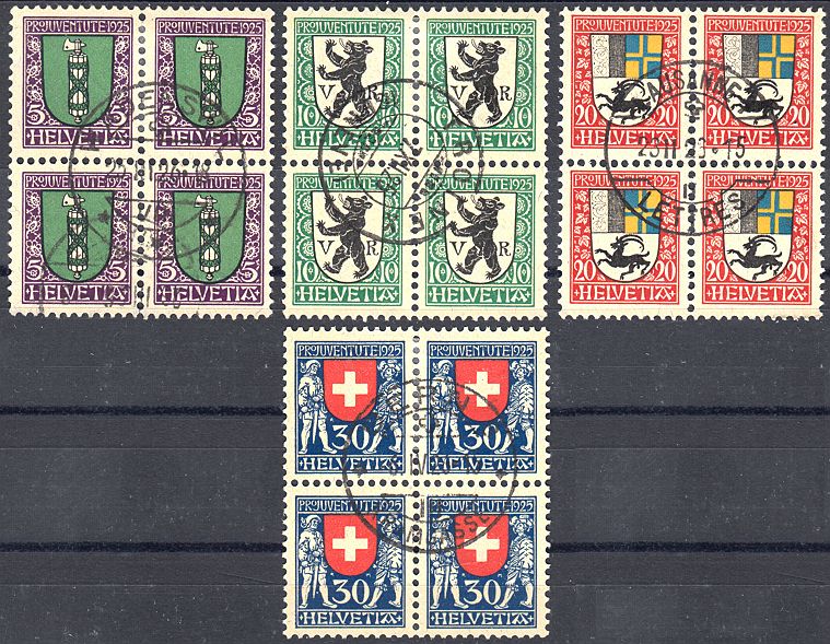 | 1925 Wappen (Kat. Nrn. J 33-36, Mi. Nrn. 214-217), komplette Serie in Viererblocks, sauber postfrisch **, fehlerfrei | CHF 18.-- |