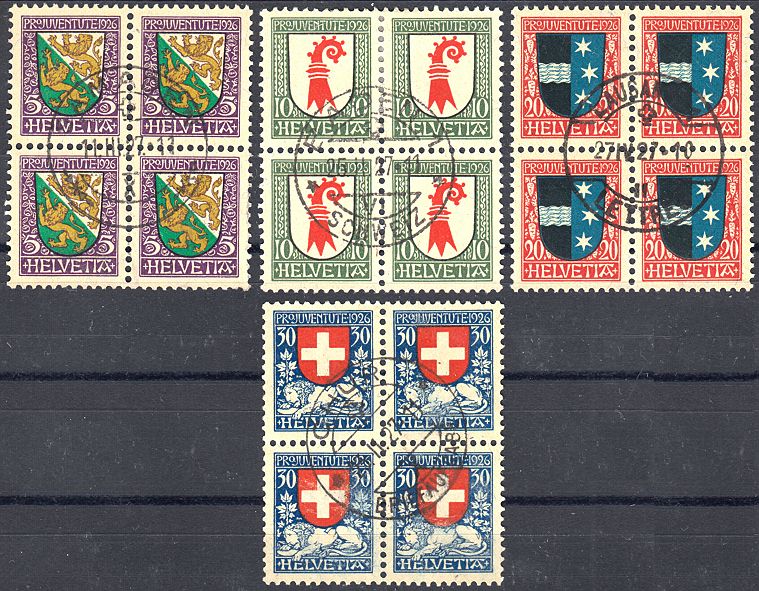 | 1926 Wappen (Kat. Nrn. J 37-40, Mi. Nrn. 218-221), komplette Serie in Viererblocks, sauber postfrisch **, fehlerfrei | CHF 15.-- |