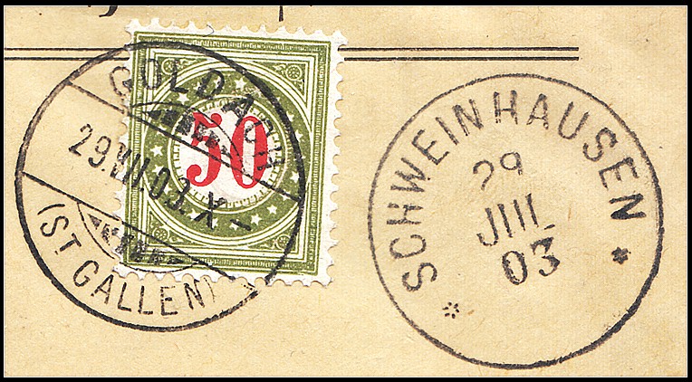 dort nachtaxiert mit 50 + 20 Rp. fahlgrün (Zst. Nrn. 19B