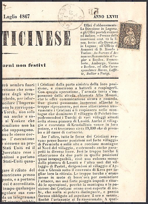 Vorderseite der GAZZETTA TICINESE vom 4. Juli 1867,