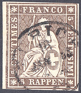 | 1859 Strubel 5 Rp. Berner Druck III (Zst. Nr. 22G, Mi. Nr. 13IIBym), allseitig weissrandig, sauber und leicht gestempelt ZÜRICH, signiert Marchand | CHF 20.-- |