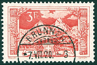 | BRUNNEN 7.VII.20, auf 3 Fr. Mythen rot (Zst./Mi. Nr.