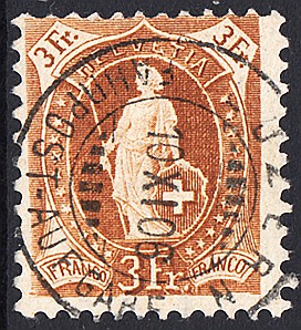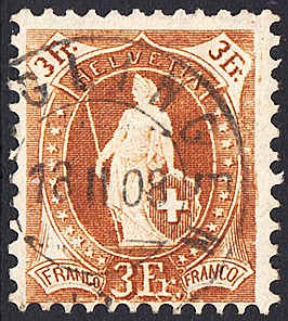 | 1907 stehende Helvetia 3 Fr. auf Faserpapier,