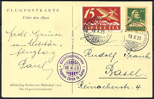 | 1925 Int. Flugmeeting Genf (LPHb SF 25.4), saubere, offizielle Karte, frankiert mit Kat. Nr. F 5, Vignette defekt, sonst ohne Fehler | CHF 20.-- |