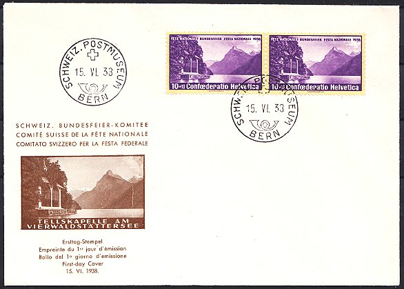 | 1938 Tellskapelle (Zst. Nr. B1, Mi. Nr. 326), waagrechtes Paar auf sauberem, illustriertem Ersttagsbrief ohne Adresse des Bundesfeier-Komitees, feinste Ersttags-Stempel BERN SCHWEIZ. POSTMUSEUM 15.VI.38, in sehr guter Erhaltung | CHF 75.-- |