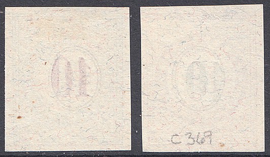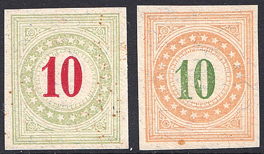 | 1883 Farbprobedrucke 10 Rp. fahlgrün/karmin und